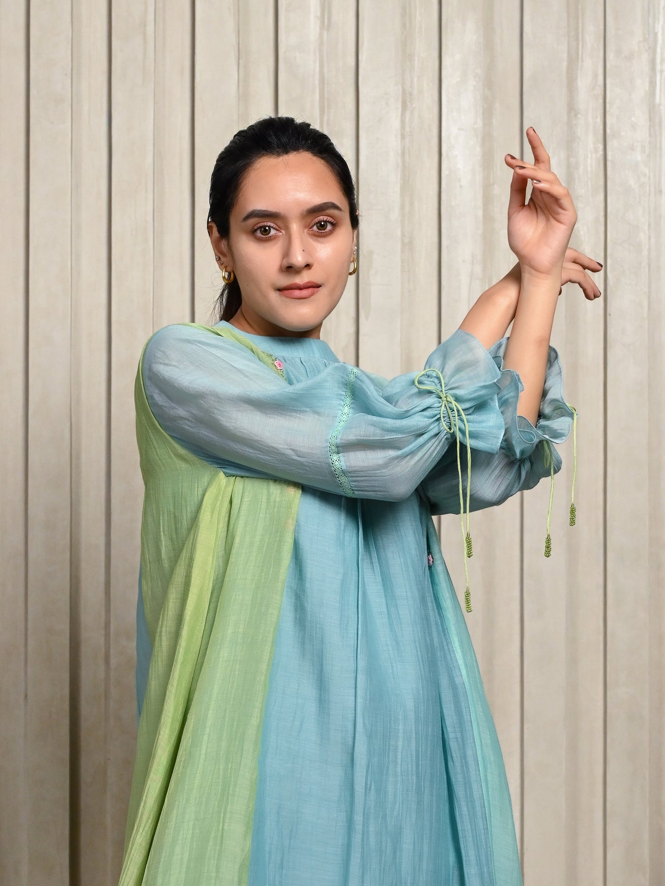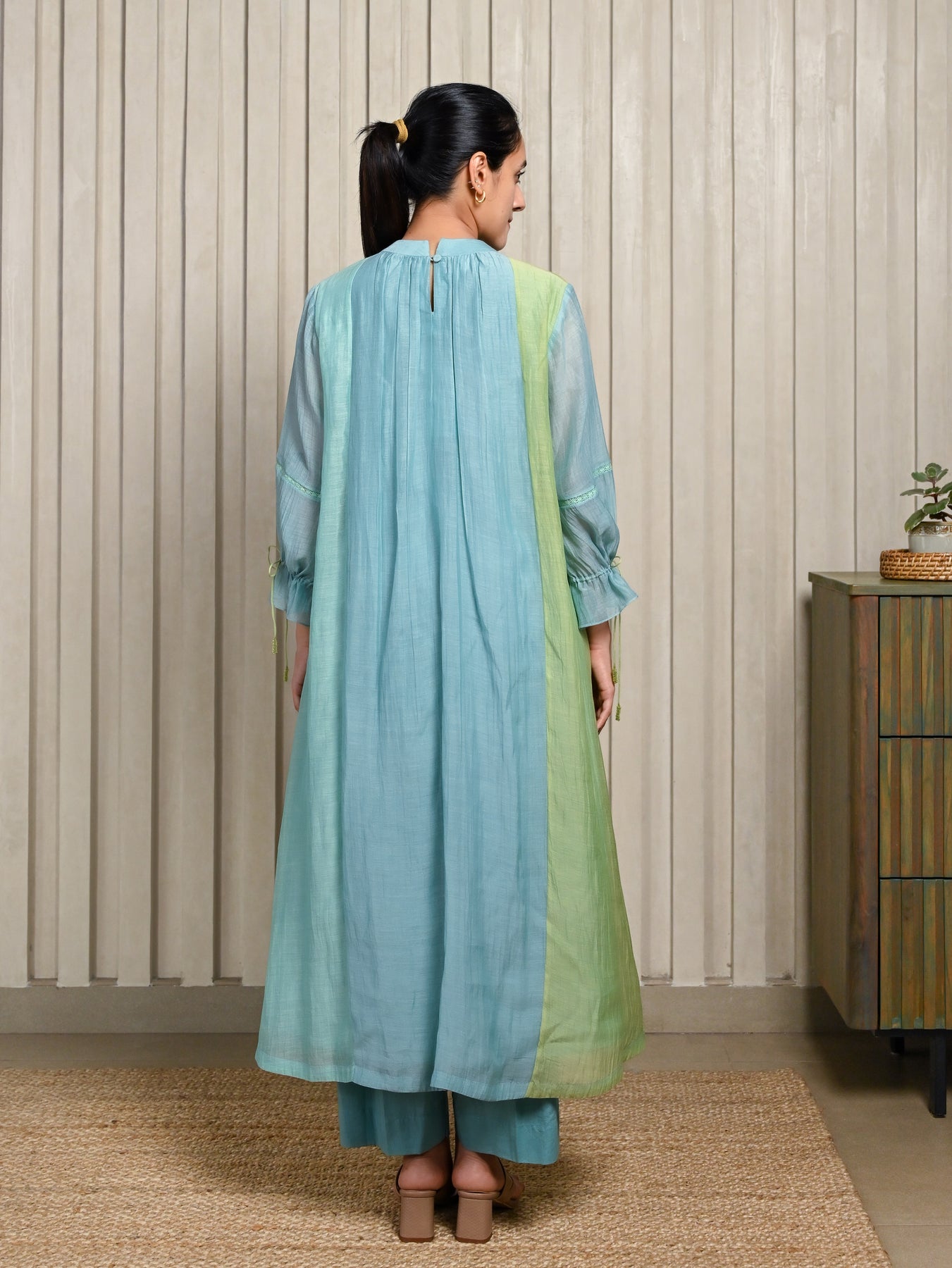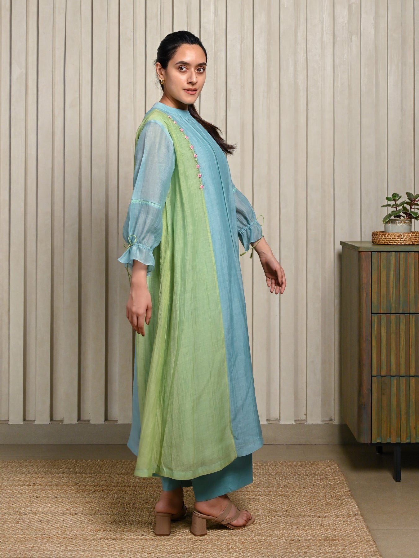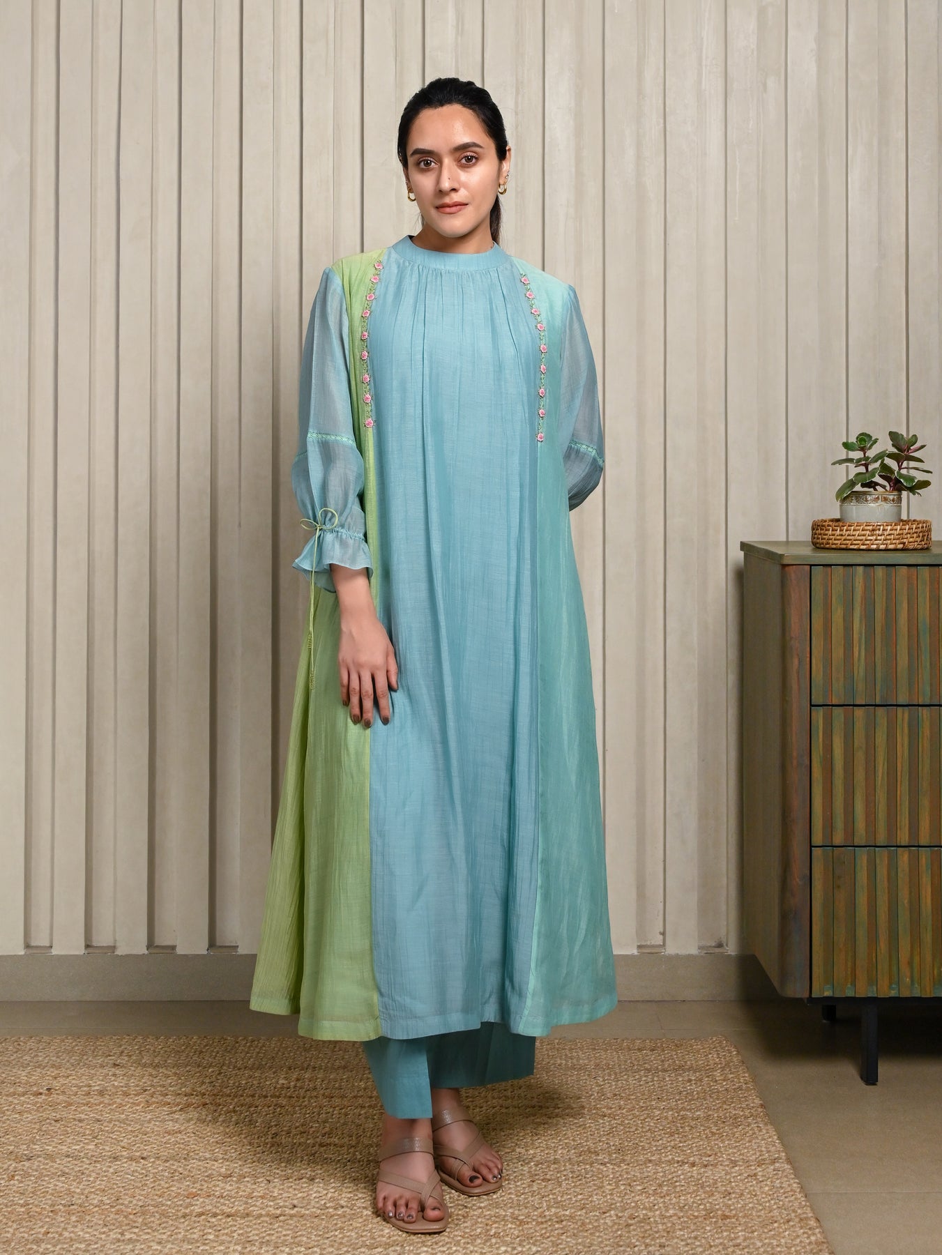 Handloom Chanderi silk kurta in soft blue tones, highlighted with delicate floral embroidery and gentle gathers for an effortless flow. Paired with a comfortable cotton bottom, it offers a refined yet easy-to-wear silhouette.