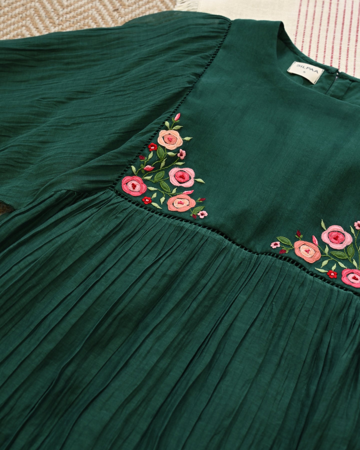 Green  handloom silk-cotton Chanderi dress featuring delicate thread embroidery on the yoke The hem is finished with pleated  detailing . Fully lined with soft cotton for comfortable wear.