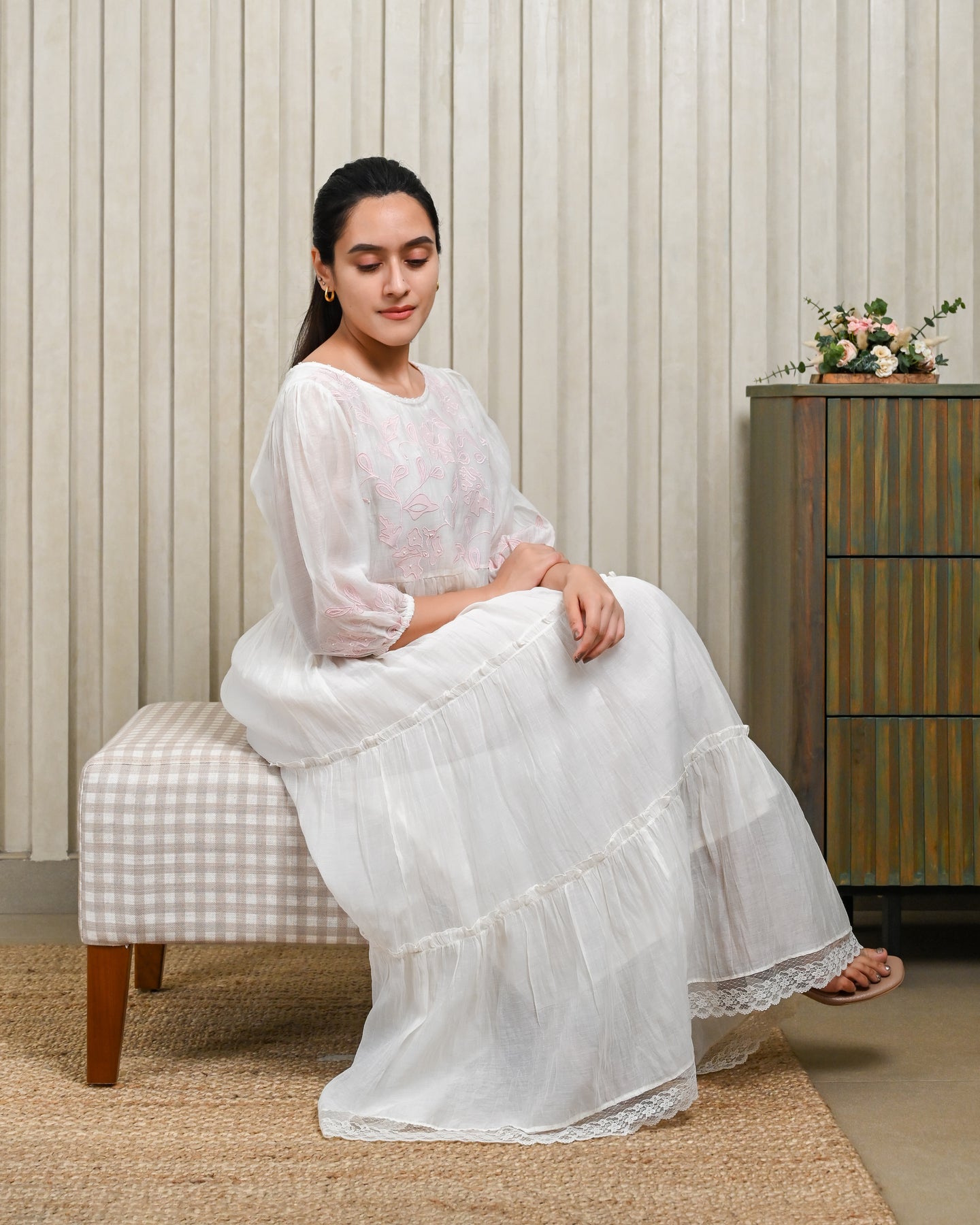Off-white handloom silk-cotton Chanderi dress featuring delicate appliqué embroidery on the yoke and sleeves. The tiered skirt portion with a lace hem adds graceful volume and movement, making it a soft and elegant festive piece.