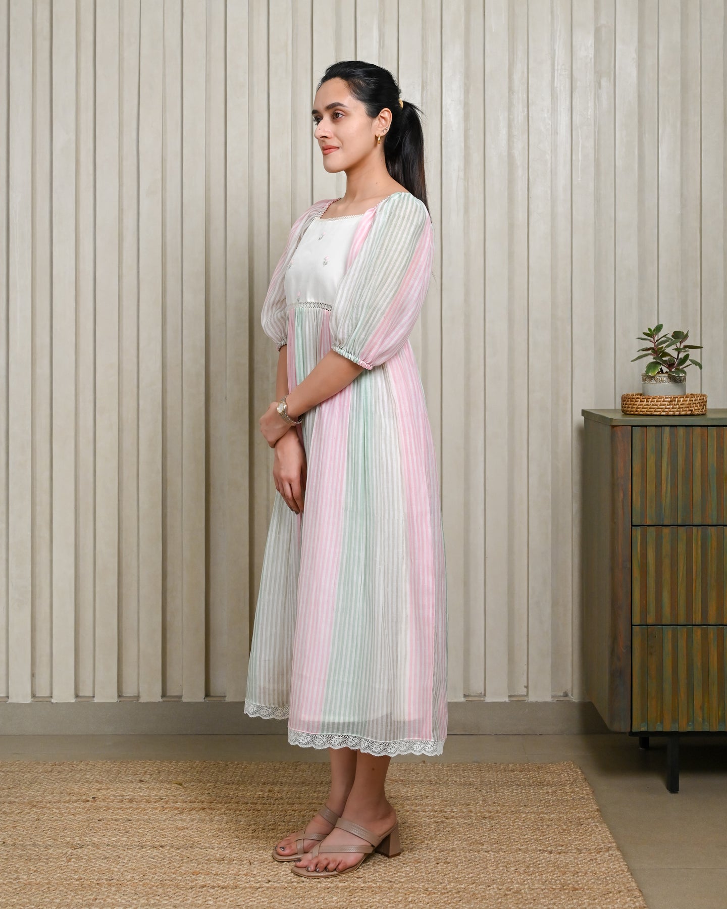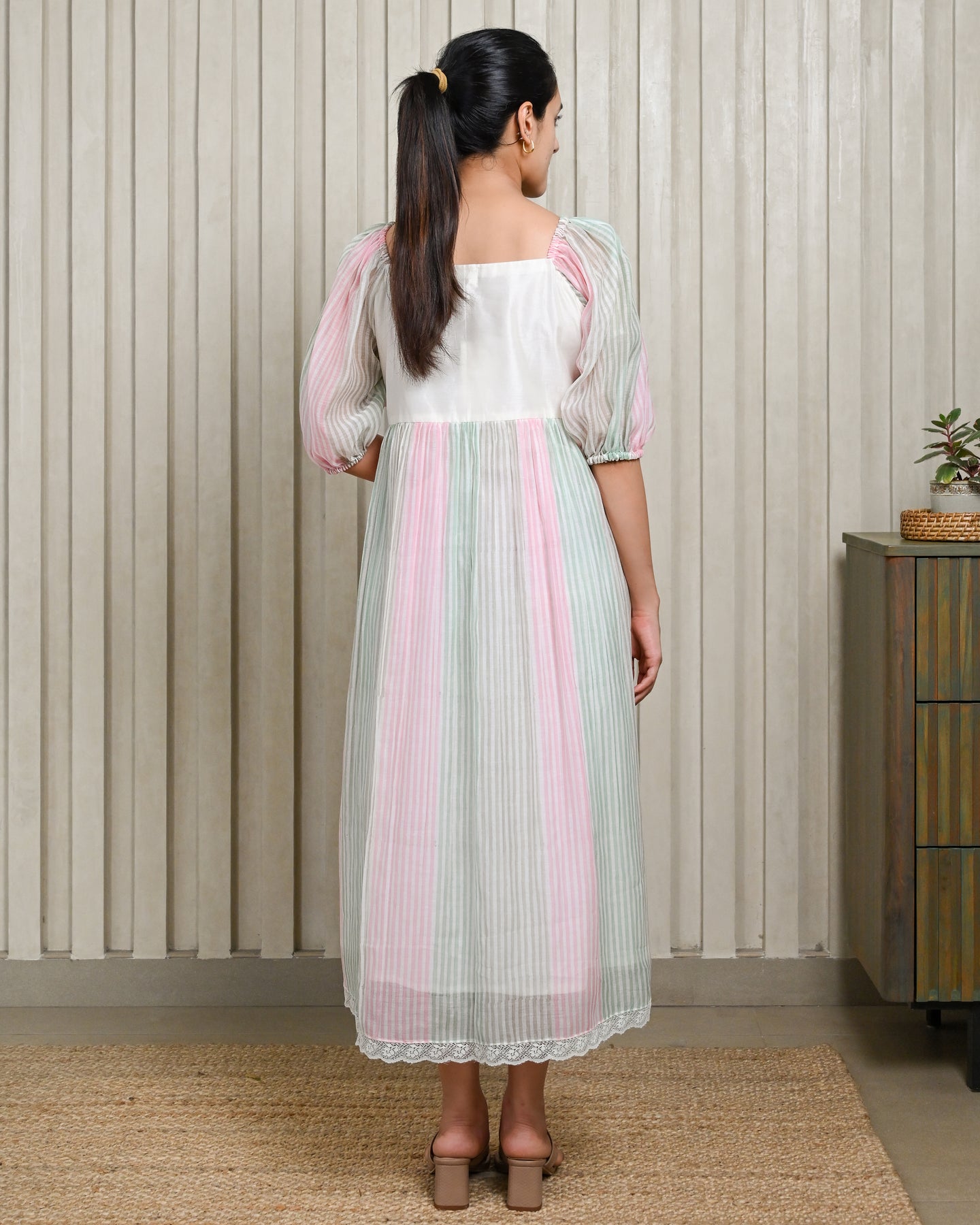Off-white, green, and pink handloom striped Chanderi silk dress, featuring an elegant off-shoulder sleeve pattern. Finished with delicate lace along the hemline for a graceful, feminine touch.