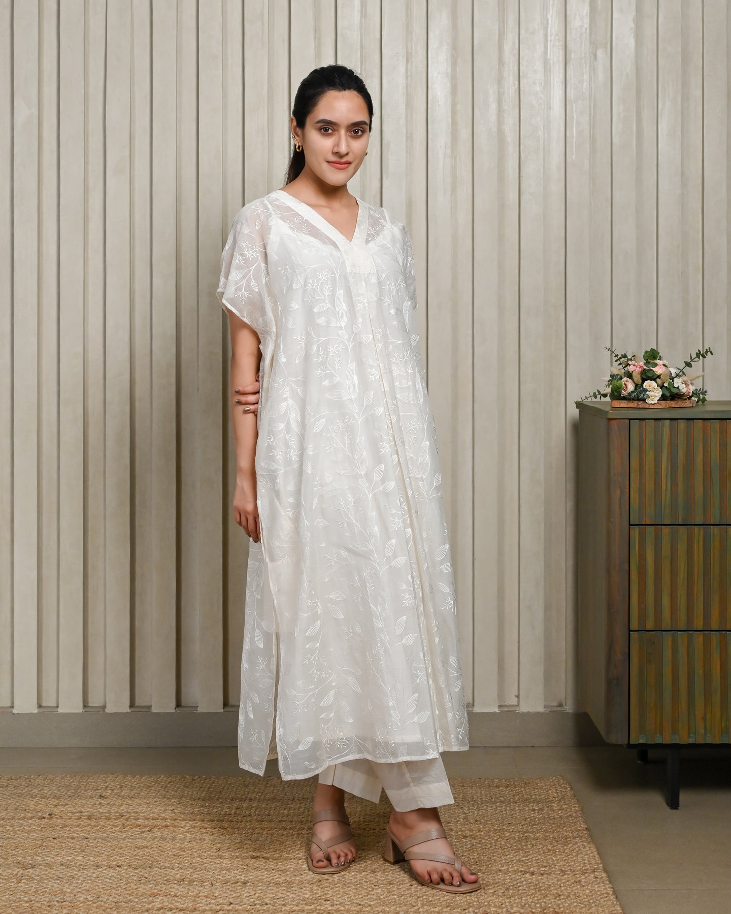 Handloom silk-cotton chanderi with delicate floral self-woven embroidery. Features a box pleat at the centre front, extended shoulder forming a soft short sleeve, and subtle and short side slits for ease and movement. Pockets are thoughtfully included on both sides, and it comes with a comfortable cotton slip and cotton bottom