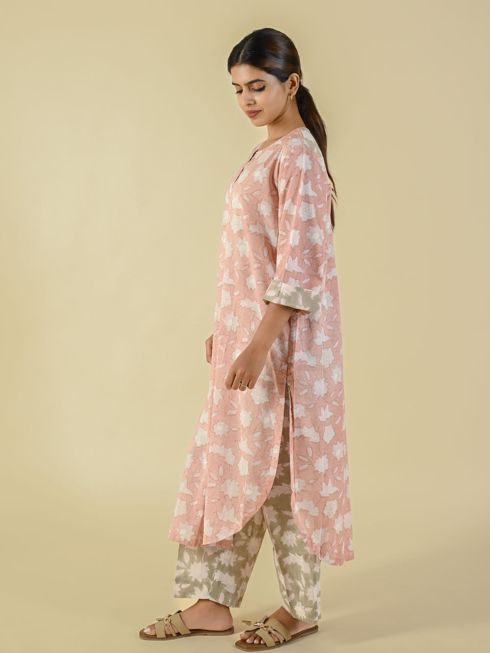 Pink & beige hand block printed cotton co-ord set
