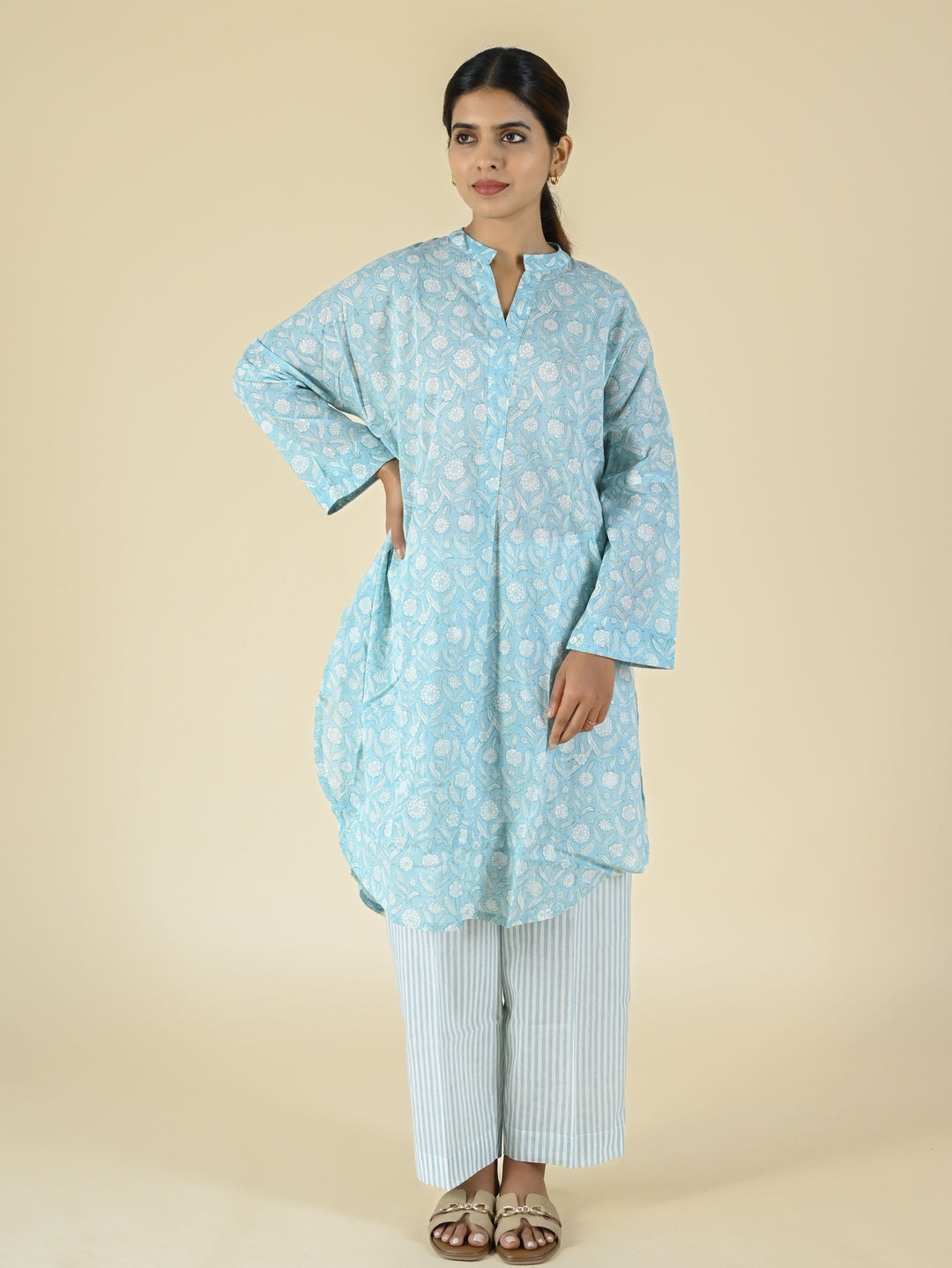Light blue hand block printed cotton tunic set