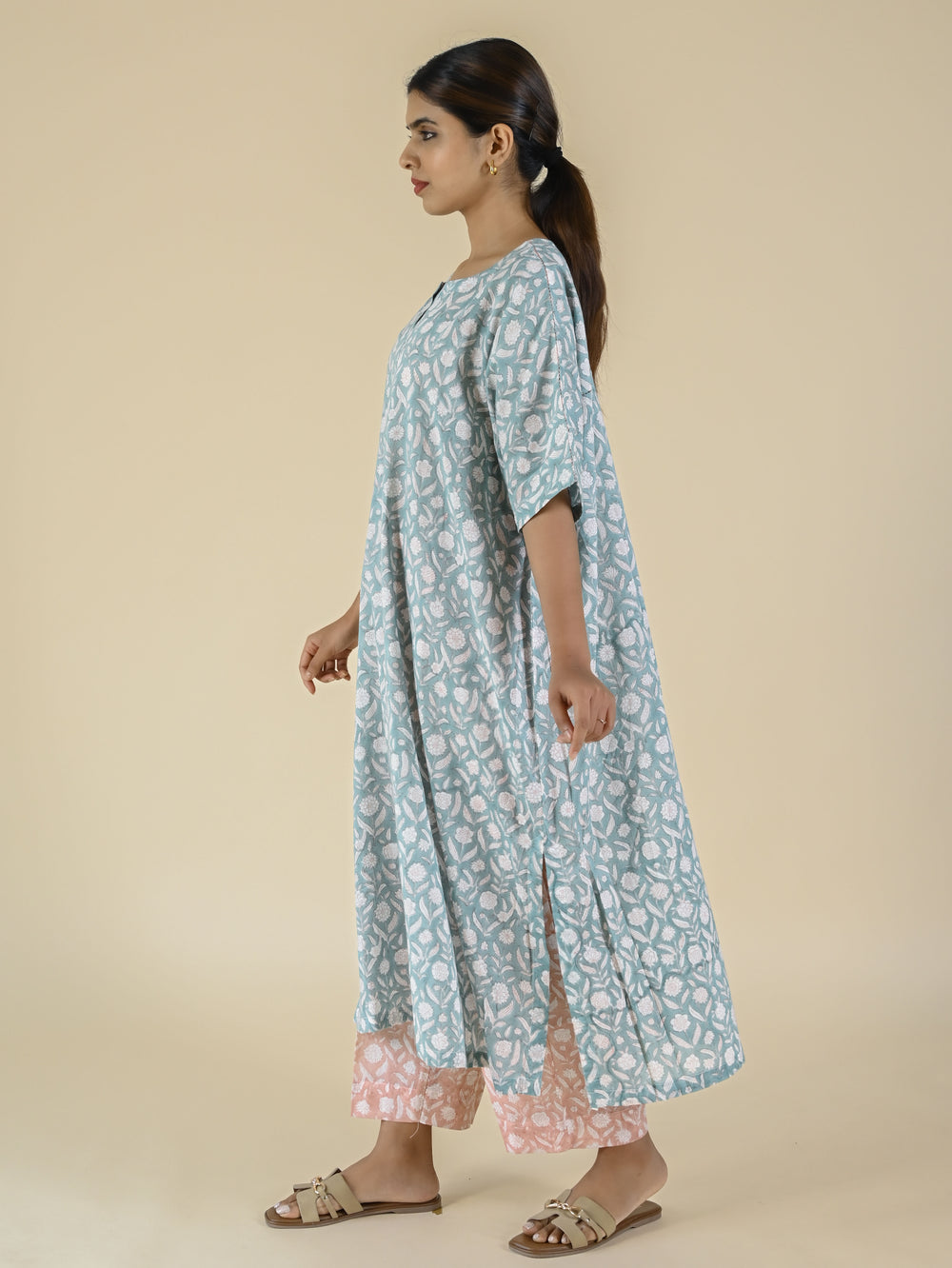Beige hand block printed cotton tunic
