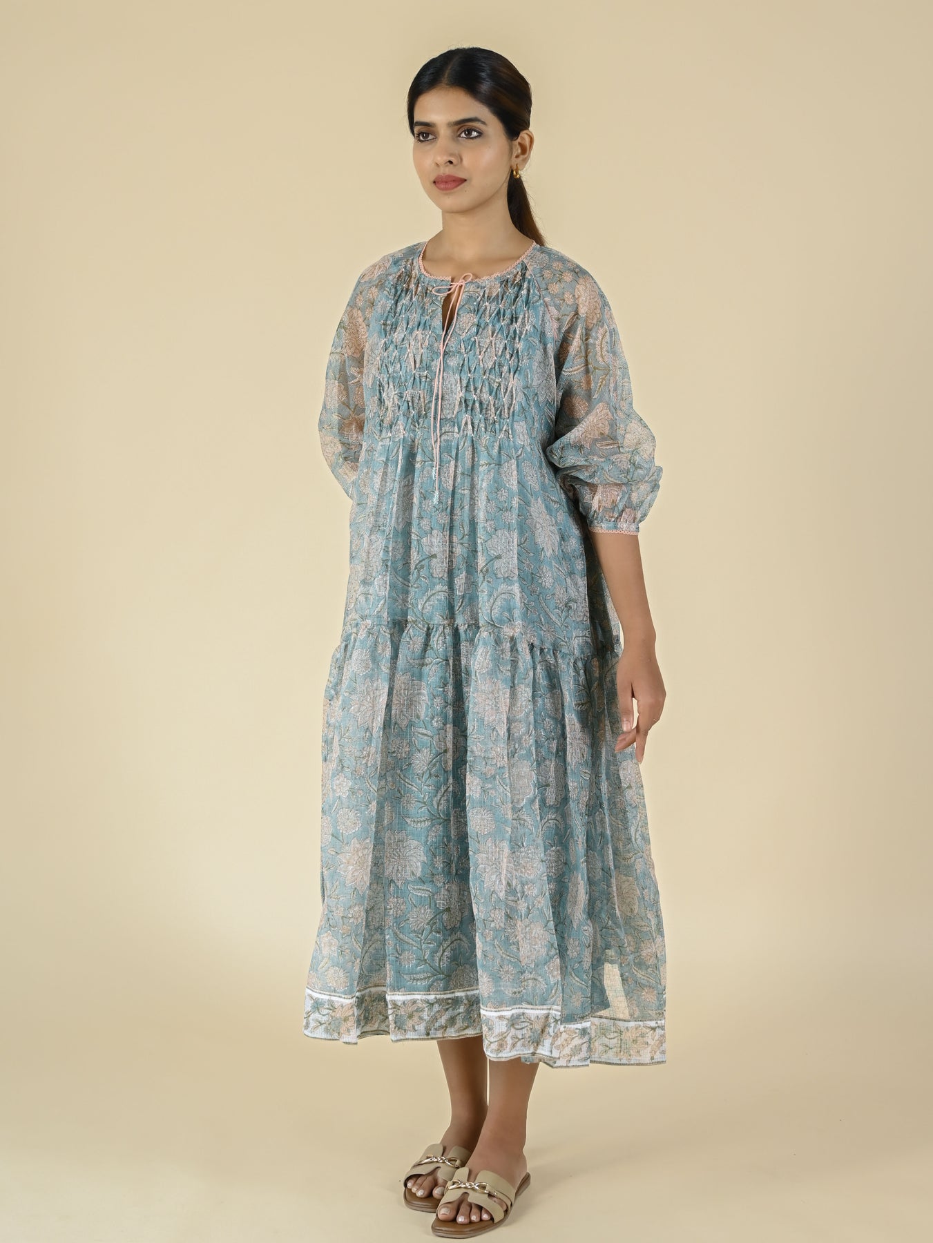 This hand block printed two-tier dress in pure kota features a smocked yoke, soft gathers, and comfortable sleeves—perfect for easy, breezy days. A timeless piece that feels as beautiful as it looks.