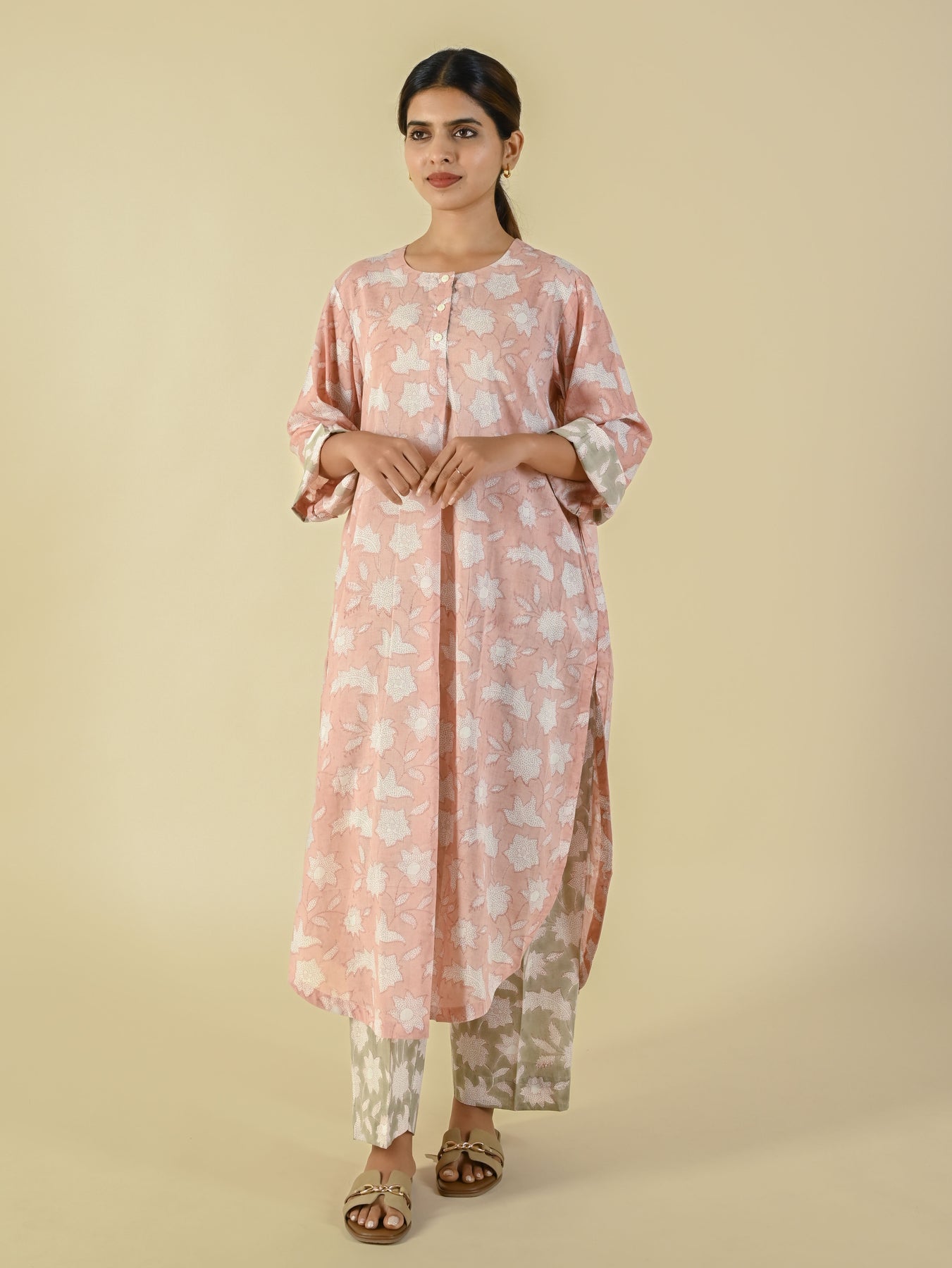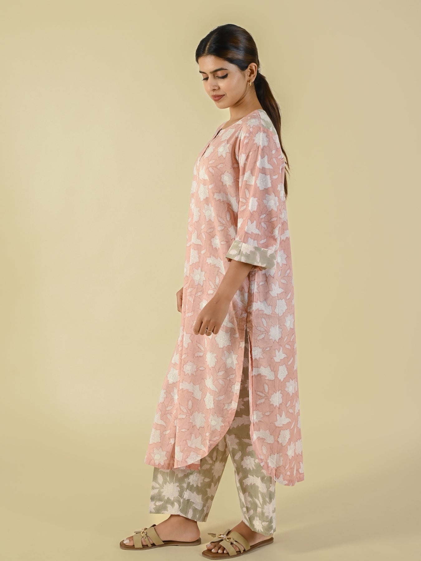 Pink & beige hand block printed cotton co-ord set featuring a pink kurta and beige pants. Designed with a centre front placket and pleat, sleeve cuffs, and a back yoke with a box pleat—finished with a soft curved hemline for an easy, elegant look