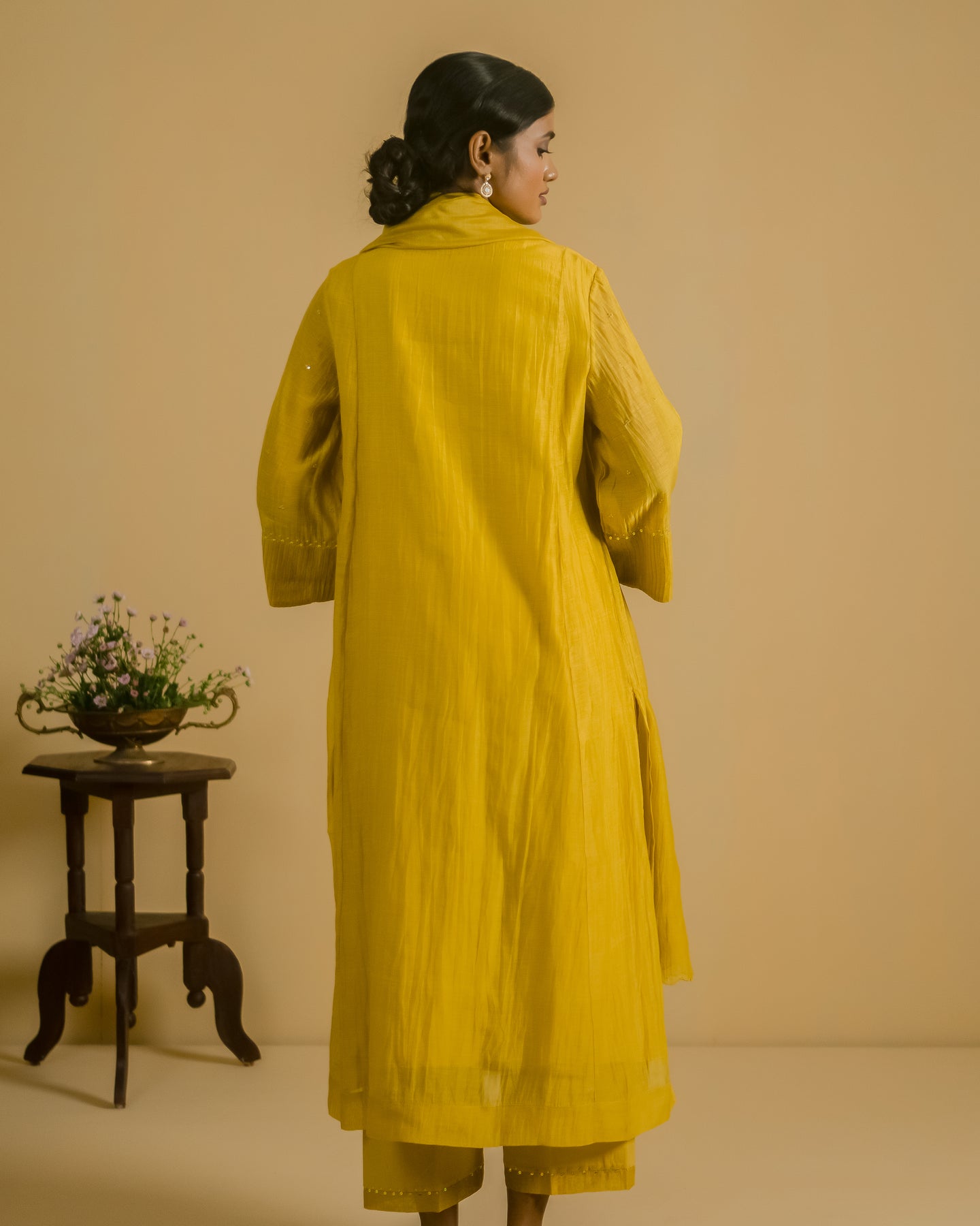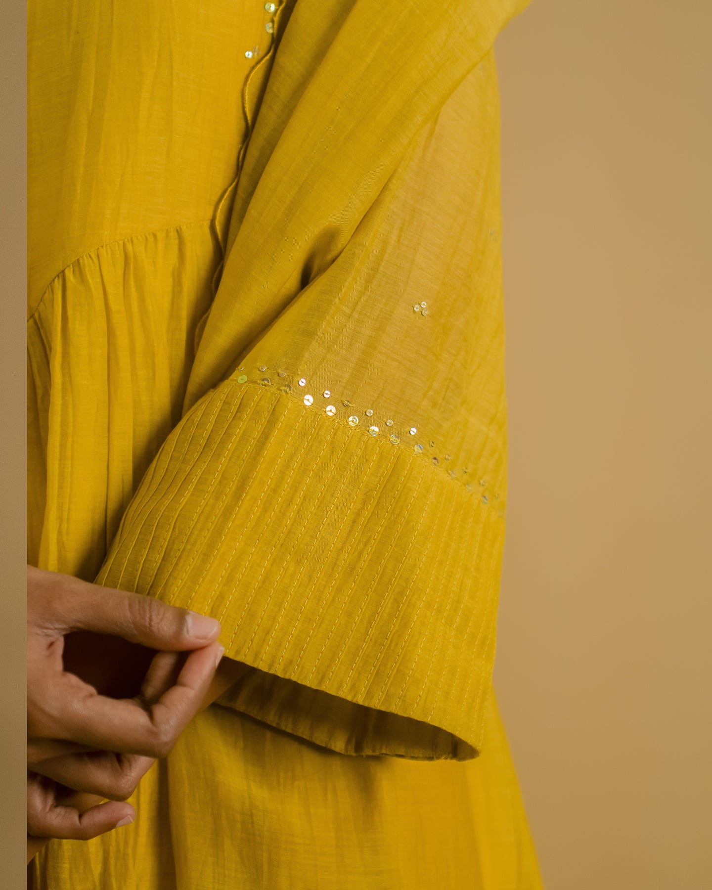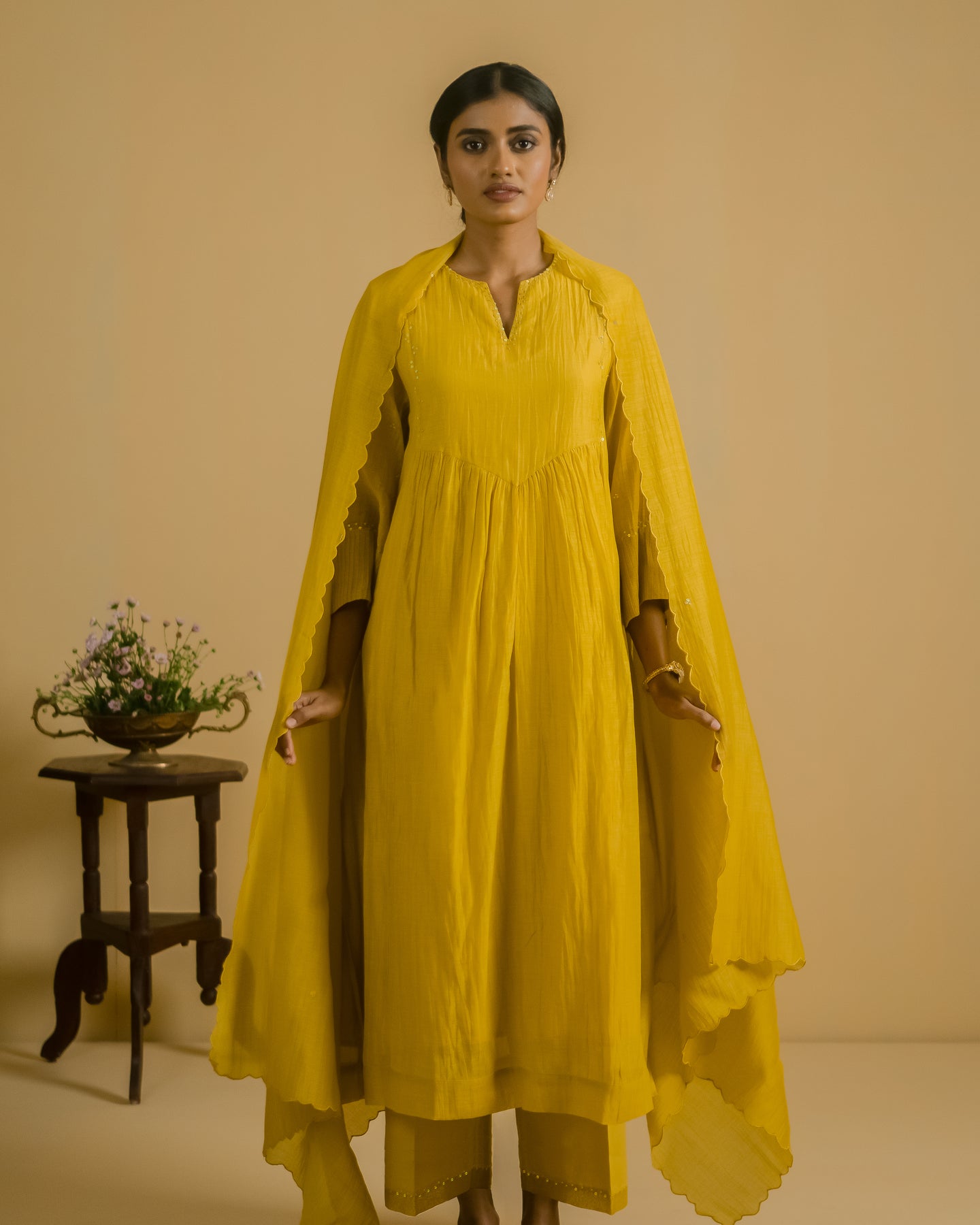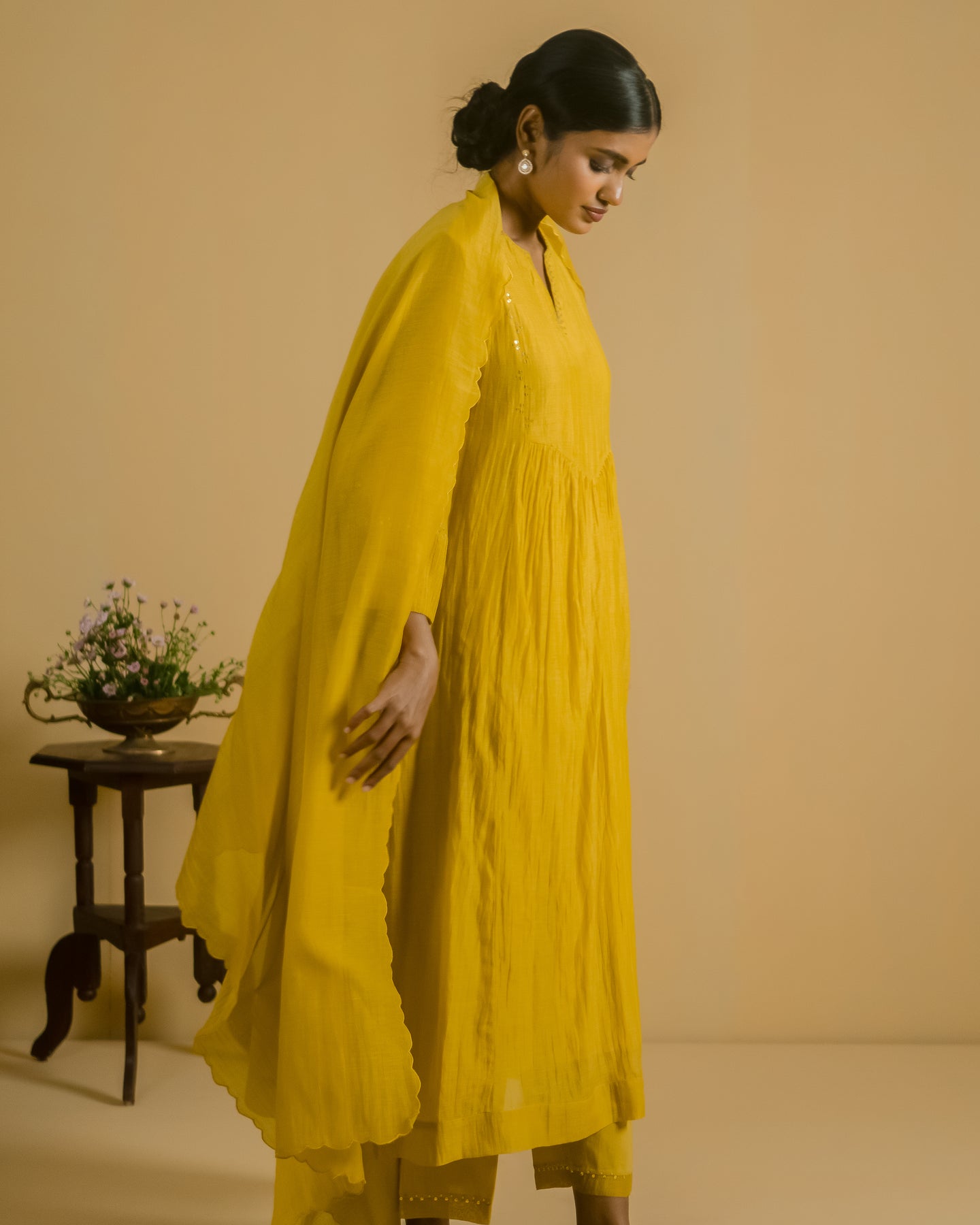 A vibrant yellow handloom silk-cotton Chanderi kurta featuring delicate sequin embroidery on the yoke, paired with matching cotton bottoms embroidered along the hemline. The look is completed with a handloom Chanderi dupatta edged with elegant scalloped borders — radiant, graceful, and full of festive charm.